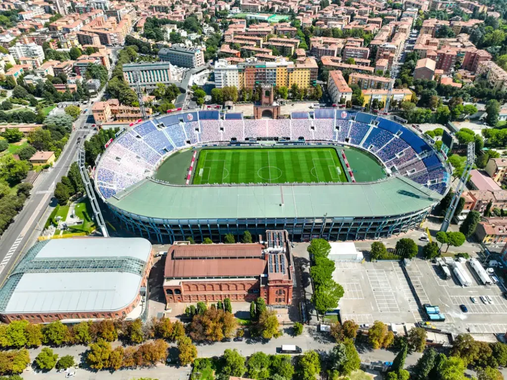 Widok z drona ukazuje stadion w jego naturalnym kontekście urbanistycznym. Bolonia, znana ze swoich czerwonych dachów, średniowiecznej architektury i tętniących życiem ulic, tworzy niezwykłe tło dla tej sportowej ikony.